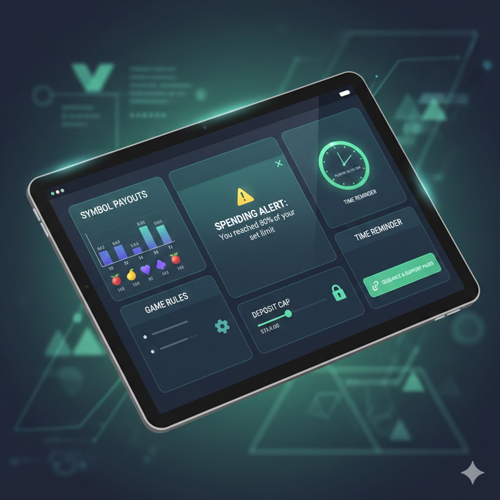 Alt Tag: Illustration of a slot platform screen showing responsible gaming tools like spending caps, time reminders, payout details, and rule summaries, symbolizing a secure and structured playing environment.