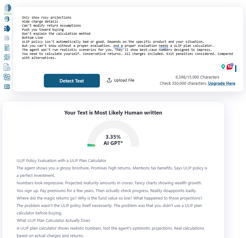 The calculator gives you control. You run different scenarios yourself. See what happens with 8% returns vs 12% returns. Check the impact if you surrender early. Calculate exact charges year-wise.